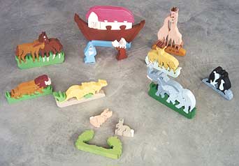 match animal shapes with wooden bases. This puzzle set has 45 pieces including an ark, Noah and his wife, and 8 pairs of animals (elephants, kangaroos, lions, horses, penguins, giraffes, rabbits, and deer).