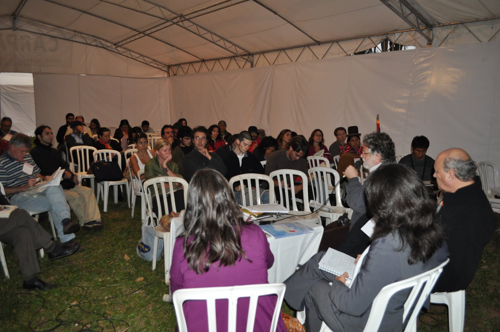 The discussions for each day of the forum are scheduled to conclude with a series of thematic panels. I chose to attend one on “Tensiones entre extractivismo y redistribución en los procesos de cambio de América Latina.” I arrived at the tent just as it started to rain, leaving me wishing that I had brought my jacket and rain poncho with me. The first speaker was Edgardo Lander from Venezuela who began talking as the technicians struggled to get the sound system to behave properly. Lander talked about the crisis of capitalism, and the struggles of new leftist governments to build new and transformative systems. Problems exist such as the dramatic increase of transgenic soy production under these progressive governments, in particular those in the Mercosur. We have an urgent need and golden opportunity to build alternative models that would lead to a more sustainable system. It’s not enough to break with capitalism because public ownership of the means of production is not enough, we need deeper transformatory changes.
