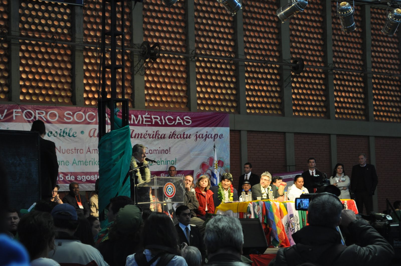 With that, Lugo strolled off the stage and out of the arena, with the whole zoo trailing along behind him. Panel moderator Mágdalena Leónfought to bring the scene back under control. After several minutes, the chaos Lugo left in his wake settled down, and we could carry on with more important discussions with social movement leaders.