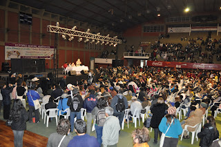 Inside the Polideportivo, there is a mad crush of a crowd and the presidents are seated on stage. People are standing everywhere, and I have trouble finding a place to position myself. Finally I find an empty chair that turns out to be right behind a post that blocks my view of the lectern from where the presidents will speak. But it doesn’t matter much, because I’m so far back and so many people are standing that I can’t get a decent camera shot anyway.